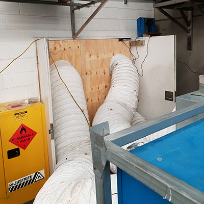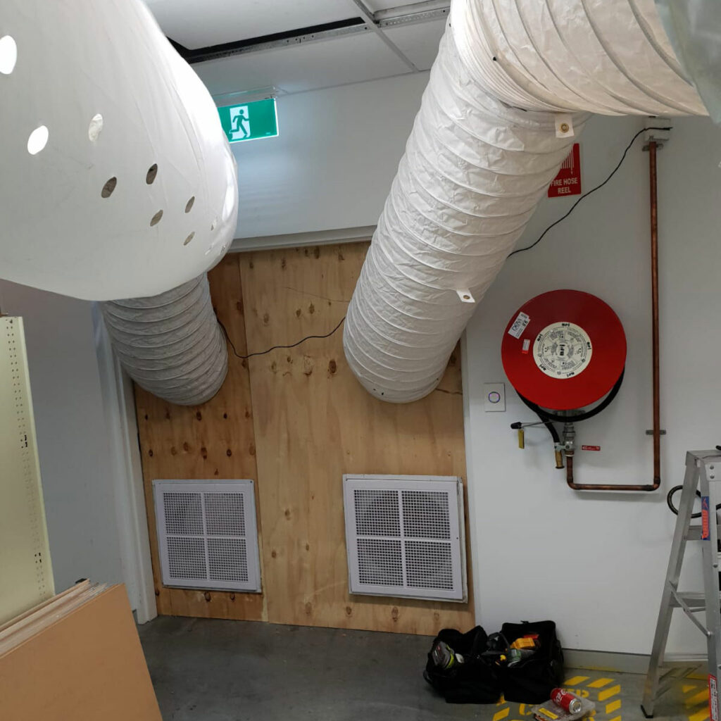 The Sydney Cool Breeze Rentals team mobilised and were onsite the next morning to install. The 64kW package unit was installed on the outside of the PCB manufacturing facility. Temporary plywood sheets were installed over an unused doorway to allow for supply and return air ducting. Inside the facility inflatable ducts were installed, suspended from the ceiling, to assist in distributing the cold air throughout the entire space. The entire installation was completed within several hours.